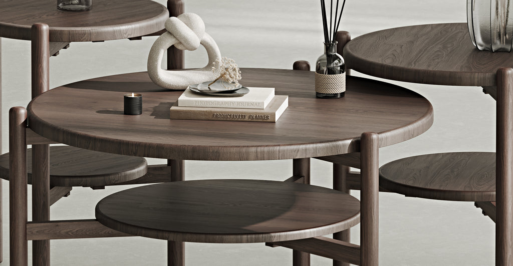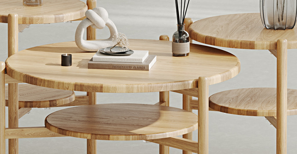 Vervollständigen Sie Ihren Wohnraum auf moderne Weise mit den natürlichen Massivholz Norac Couchtischen, die in drei verschiedenen Größen erhältlich sind.