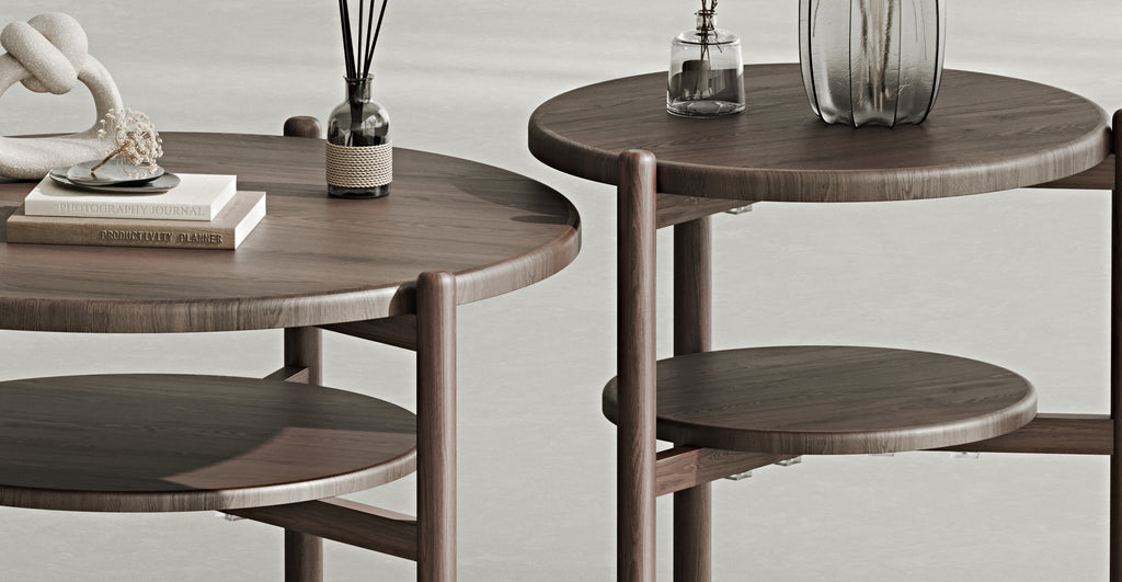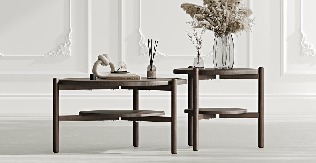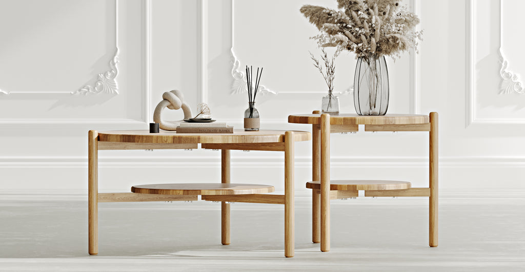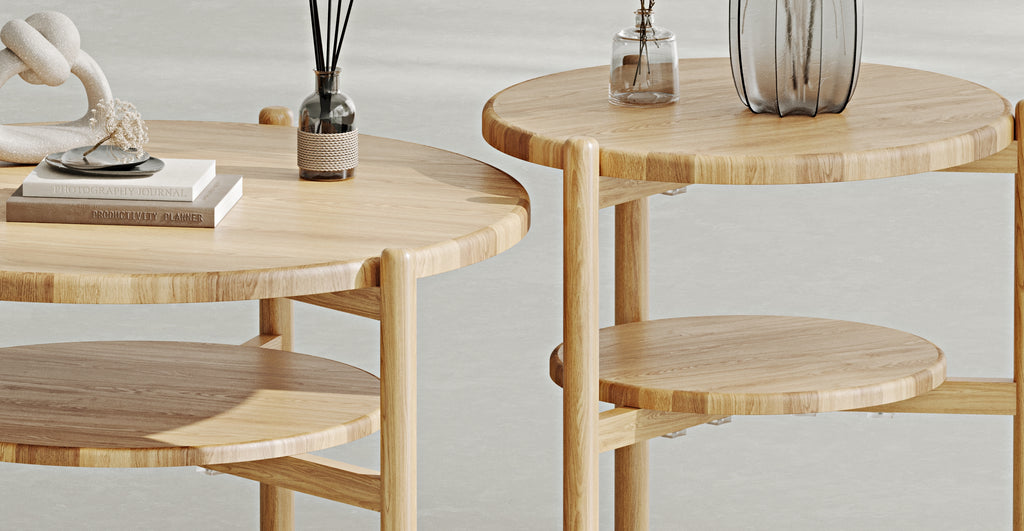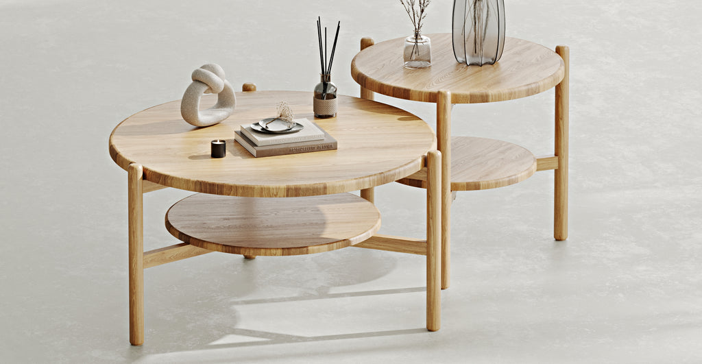 Vervollständigen Sie Ihren Wohnraum auf moderne Weise mit den natürlichen Massivholz Norac Couchtischen, die in drei verschiedenen Größen erhältlich sind.